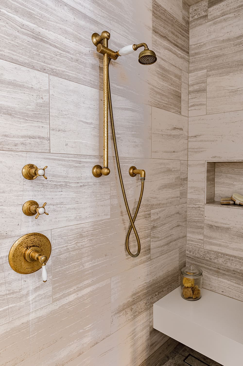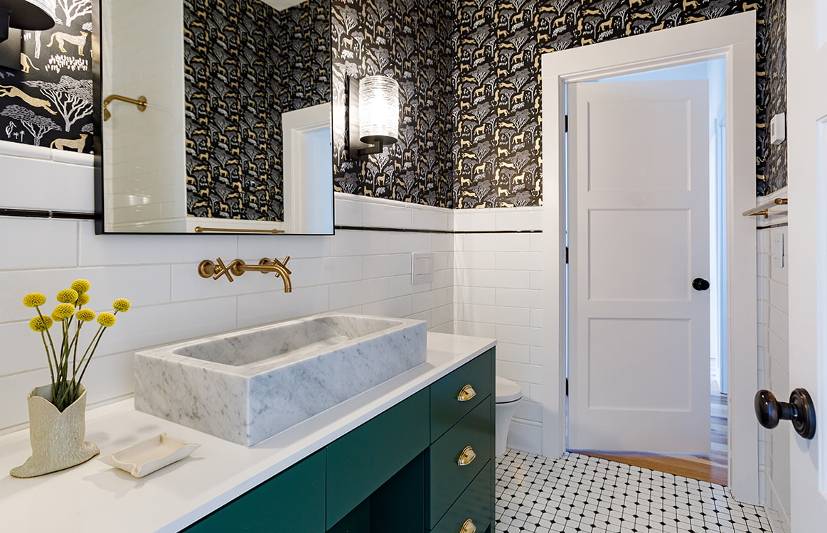This interior remodel was done to enhance functionality. Walls were moved or removed to create more space and improve natural light. The kitchen and bathrooms were modernized by updating fixtures, countertops, appliances, and cabinetry and adding custom features. A hand-welded railing was installed in the kitchen, complementing the stairs and adding built-in storage and shelving to maximize space.